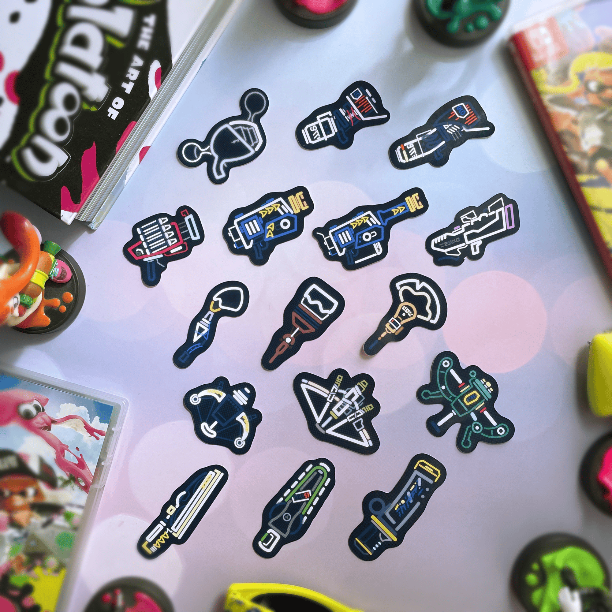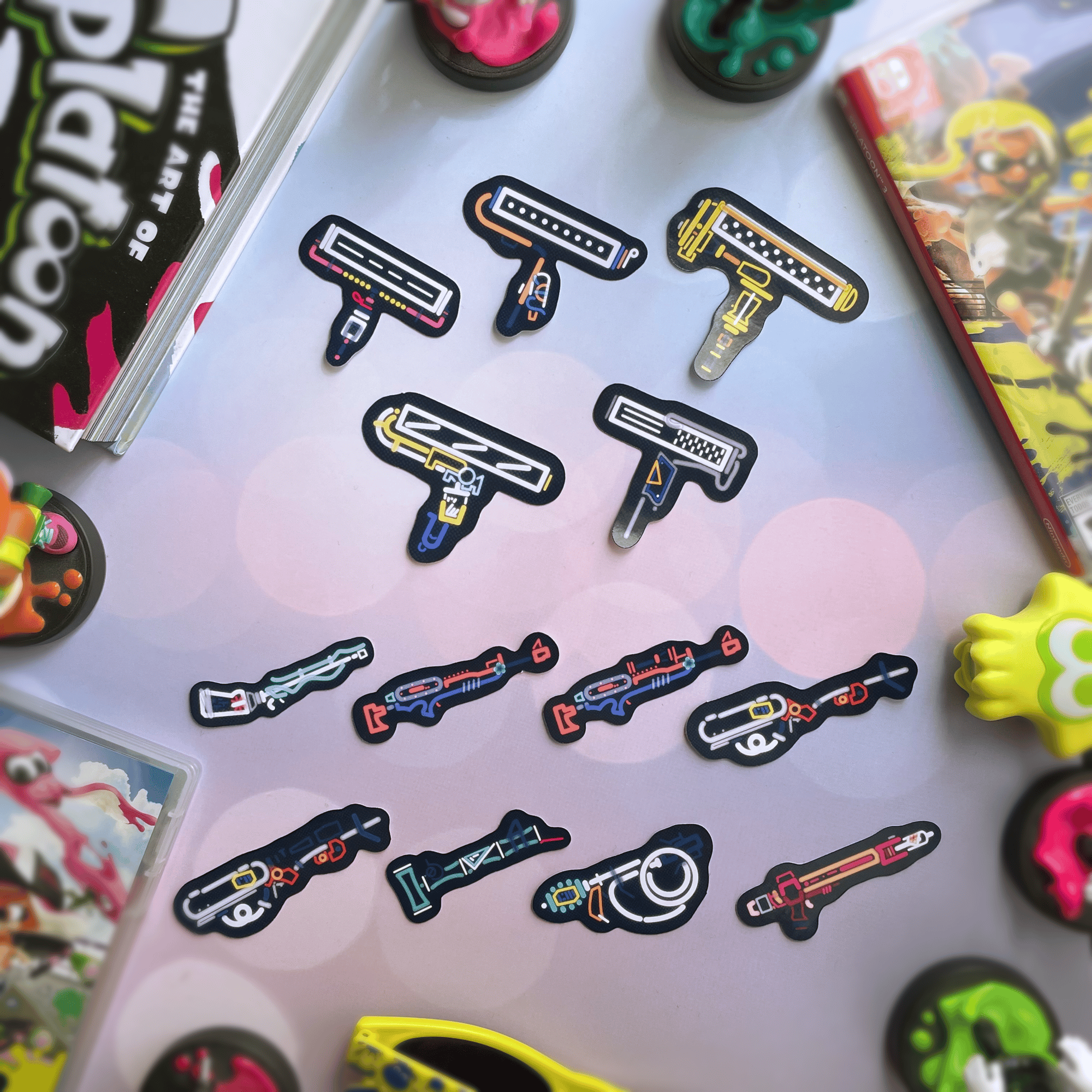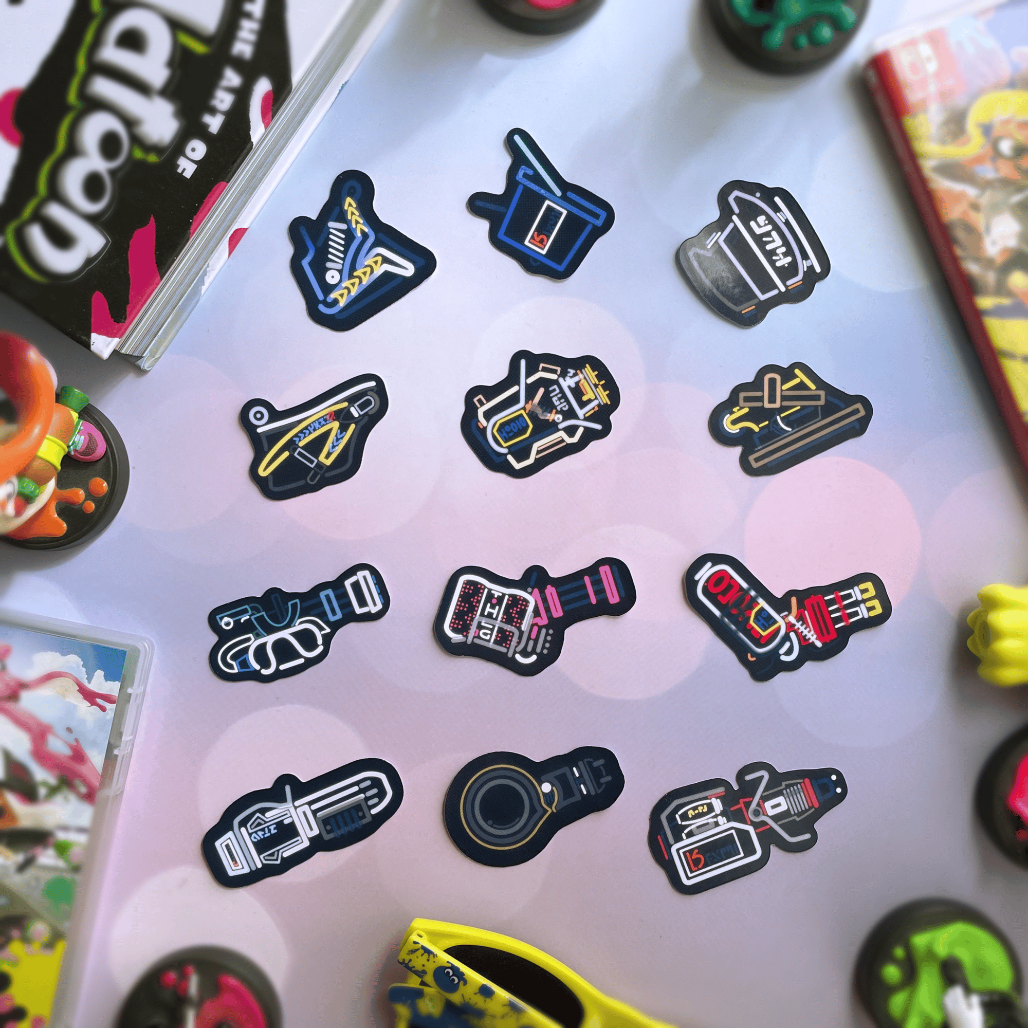 Stickers of the weapon badges from the Splatoon series in the style of neon signs! This page houses all of the secondary kits!